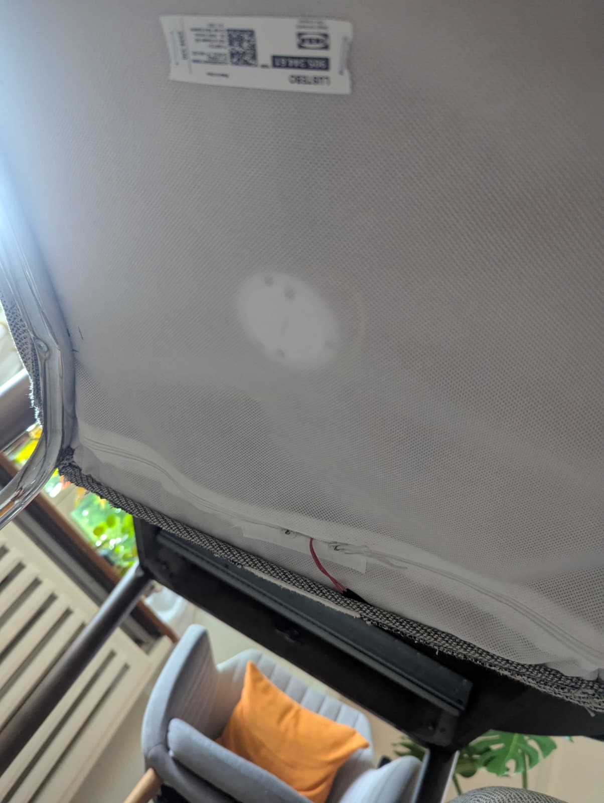 Then I placed the long film sensor below the cushion of our couch. To my surprise, even though it seemed rather insensitive without the cushion, after adding the cushion it triggered consistently even when only my feet lay on the half with the sensor. Maybe it triggers better when force is evenly distributed, or the weight of the cushion placed enough weight for my feet to push it over the threshold.