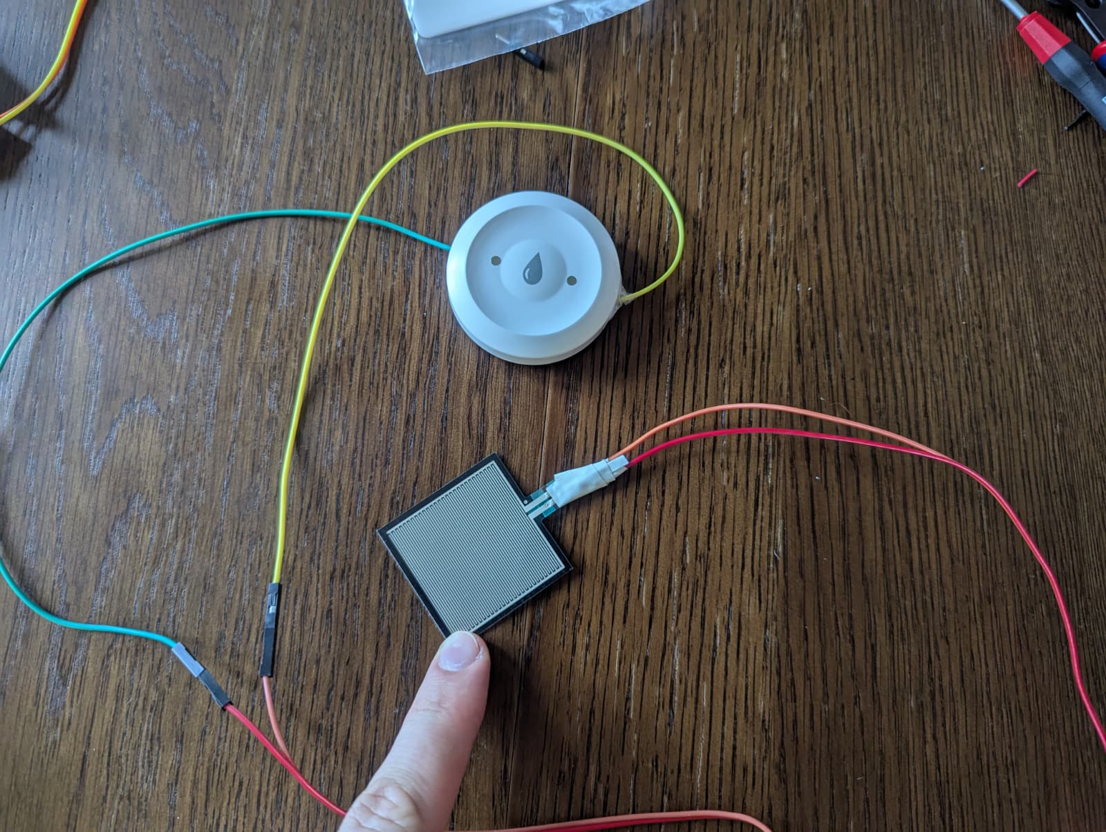 This solution is based on a cheap water leak detection board and a small thin force pressure sensor. I am placing this solution first because I think the board is the best for most usecases. Battery-powered, it can be deployed almost anywhere. It can be easily adapted for the jumper cables. And it is quite small.