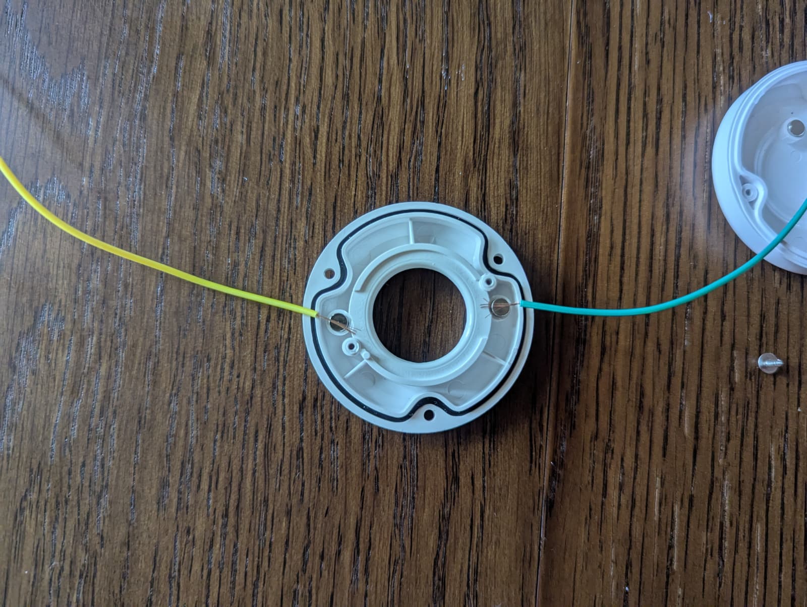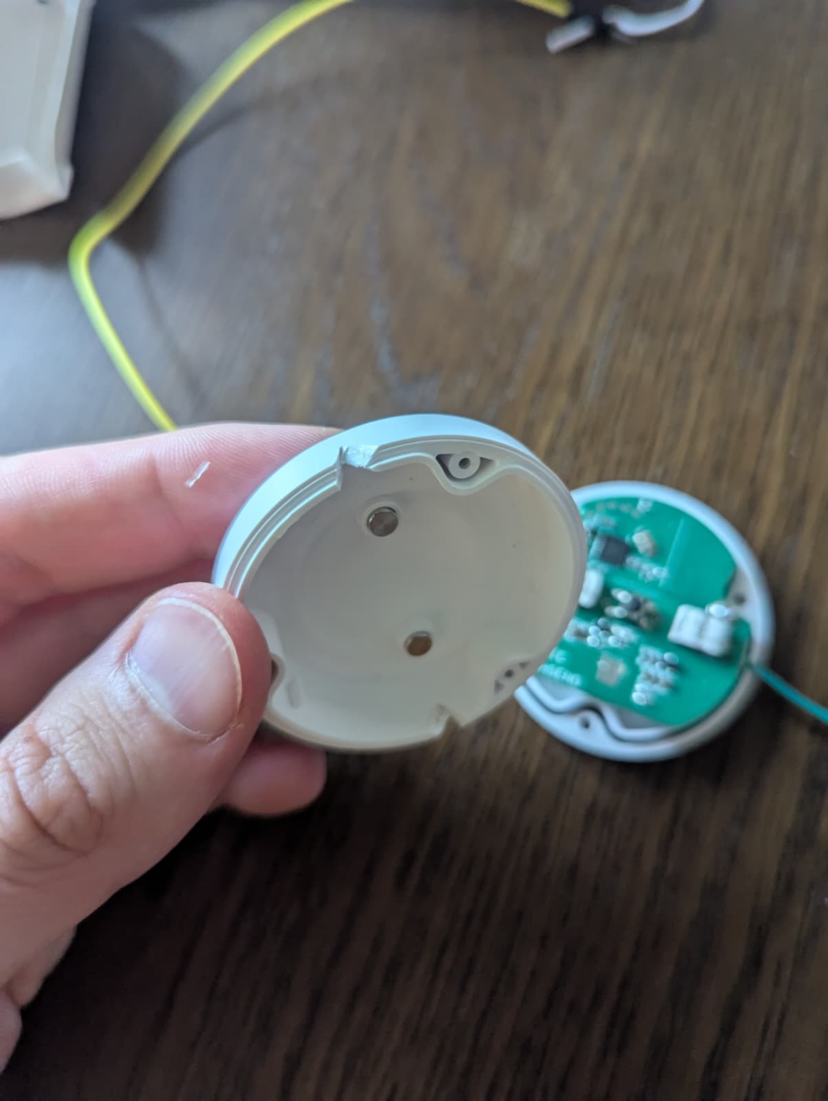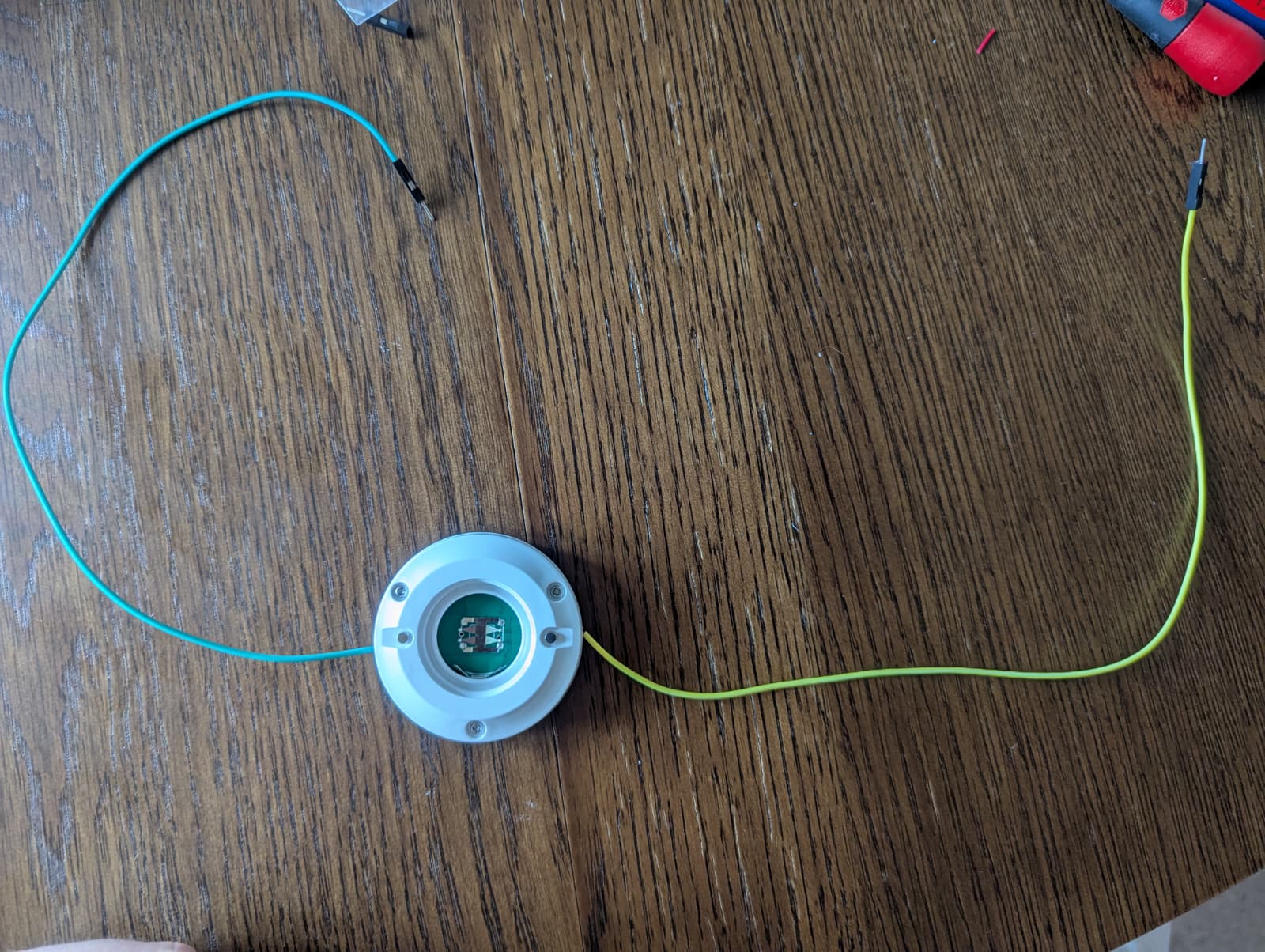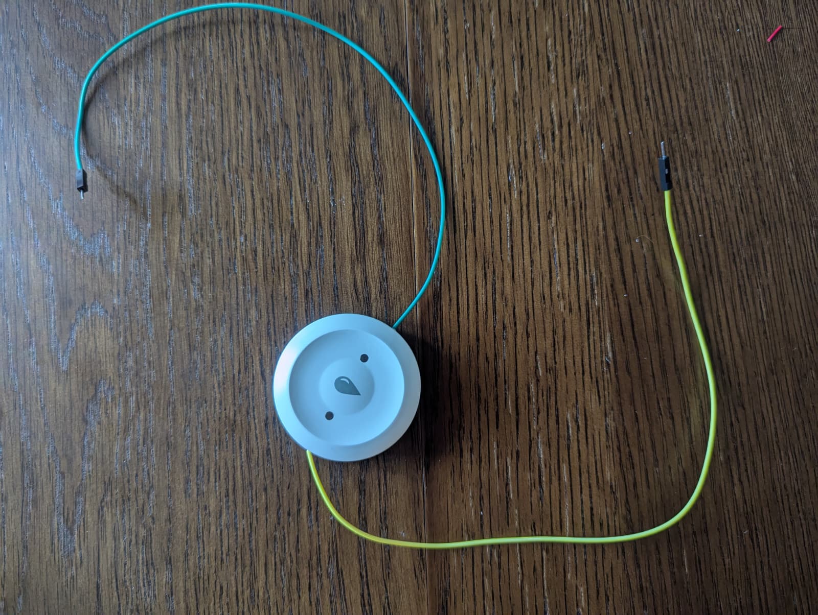 First, I opened the water leak detector, removing the top cover and the main board. The sensor has two exposed contacts on each side (top and bottom) and these connect to the main board inside the sensor through some cushion-y setup. I cut off one end of a jumper cable, removed insulation and the laid it on top of the bottom contact inside the sensor. Then I screwed the main board back onto the sensor, effectively squeezing the cable in. This worked great and appears to be quite robust!