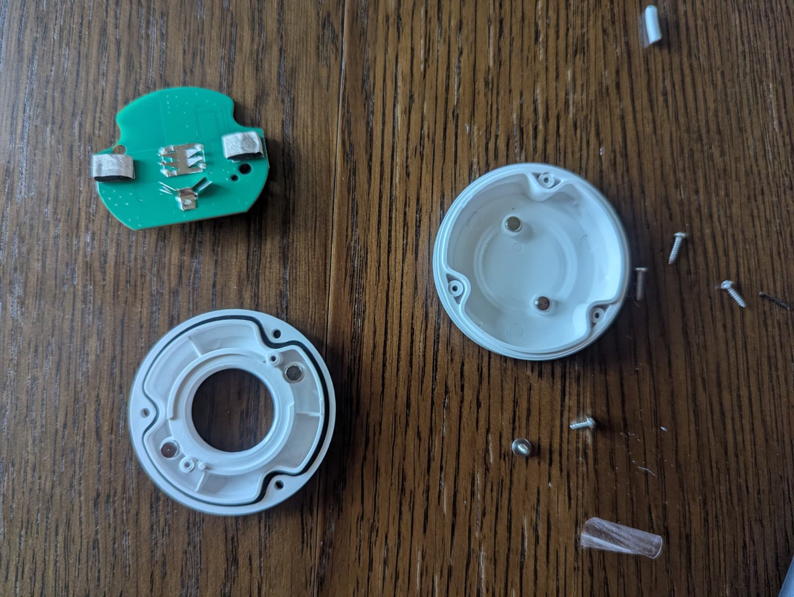 Water leak detectors turned out to be the perfect base.2 They already expose contacts designed to trigger when bridged by water – and with a pressure sensor in place of water, they work beautifully for seat detection. To test the idea, I ordered a mix of leak detectors and pressure sensors from AliExpress, hedging against potential duds. To my surprise, every single one worked!